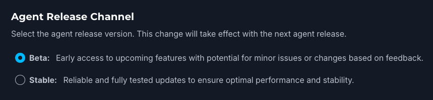 This guide explains how you can manage automatic agent upgrades for your devices, as well as manage the agent release channel your devices are on (Stable / Beta).