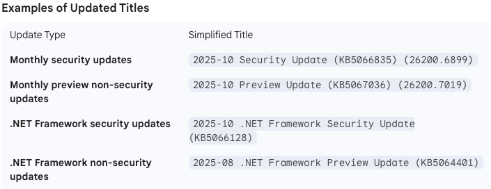 Microsoft’s simplified naming approach consolidates 'Cumulative Updates' into 'Security Update' titles for devices on Windows 24H2+.